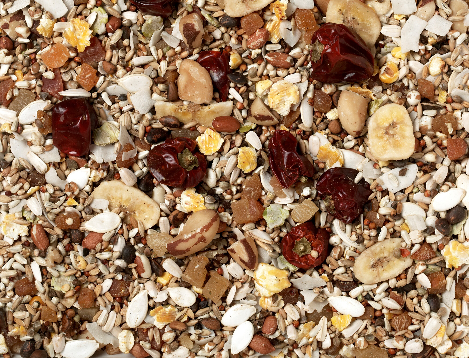 safflower seed, natural groats, red dari, white dari, wheat, hempseed, 5% white sunflower seed, buckwheat, flaked peas, flaked maize, puffed maize, puffed wheat, papaya, chillies, dried apricots, paddy rice, coconut, banana chips, pine nuts, peanuts, pumpkin seed, diced pineapple, brazil nut kernels, walnut halves and vegetable oil.