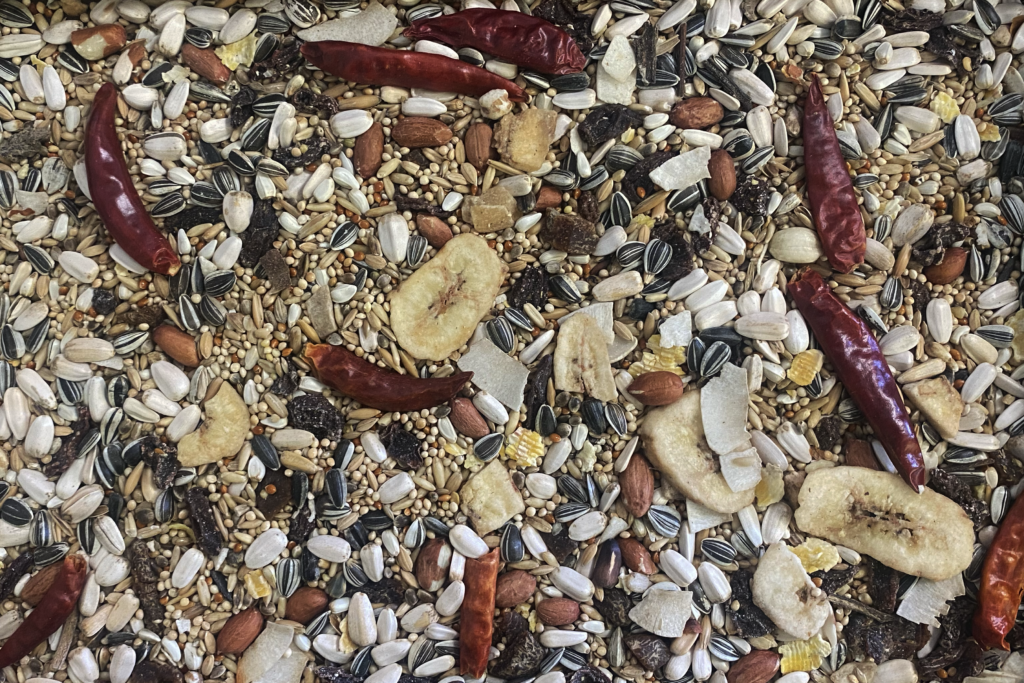 yellow millet, natural groats, white sunflower seed, safflower seed, red millet, plain canary seed, small dark striped sunflower seed, hempseed, chillies, currants, paddy rice, peanuts, flaked maize, banana chips, apricots, coconut chips, diced pineapple, mixed red & green bell pepper and diced papaya